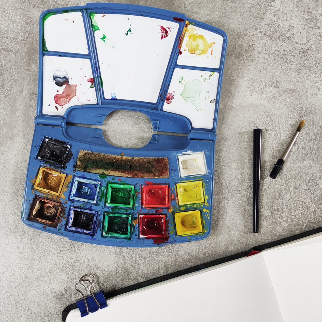 Es gibt Tuben oder Näpfchen. In den Tuben befindet sich bereichts angefeuchtete Farbe, bei den Näpfchen musst die die Farbe mit einem feuchten Pinsel anlösen. Für mich funktionieren die Näpfchen sehr gut sie sind eine zeit- und platzsparende Variante und eignen sich außerdem hervorragend gut zum Malen unterwegs. Praktischerweise entscheidest du dich für einen kleinen Aquarellkasten, der eine übersichtliche Menge an Farben bereit hält. Bemerke, dass du deine Farben auch untereinander mischen kannst. Solltest du im Folgenden mehr Farben benötigen, kannst du diese auch einzeln nachkaufen. Ein solcher Kasten lässt ich nach dem Gebrauch einfach schließen und platzsparend verstauen.