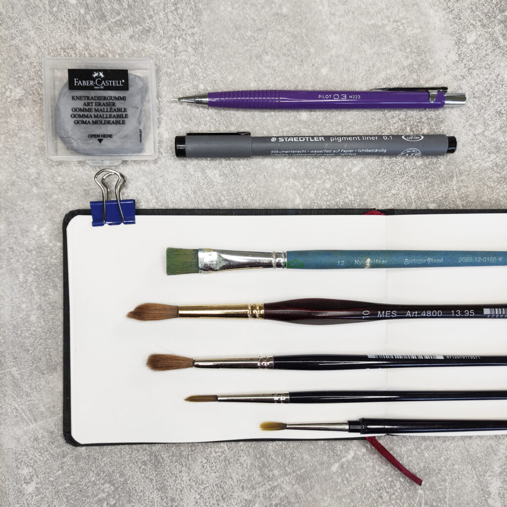 Ich besitzte ganze fünf Aquarellpinsel, wobei ich eigentlich nur die mittleren Drei wirklich nutze. Zum Vor- bzw. Nachzeichnen verwende ich außerdem Bleistift und Pigmentliner und ebenfalls nicht fehlen darf mein Knetradierer.